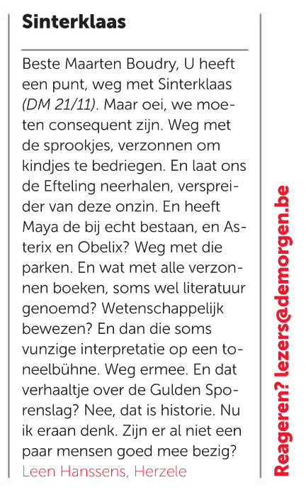 Een draadje over Sinterklaas. Talloze mensen maakten het punt uit deze lezersbrief: 'Wat dan met Sneeuwwitje/Samson/Spiderman en alle andere verzonnen figuren?' Er is één cruciaal verschil: we maken kinderen niet wijs dat Spiderman echt bestaat en dat Samson een echte hond is. /1pic.twitter.com/FgxQ4nemsP