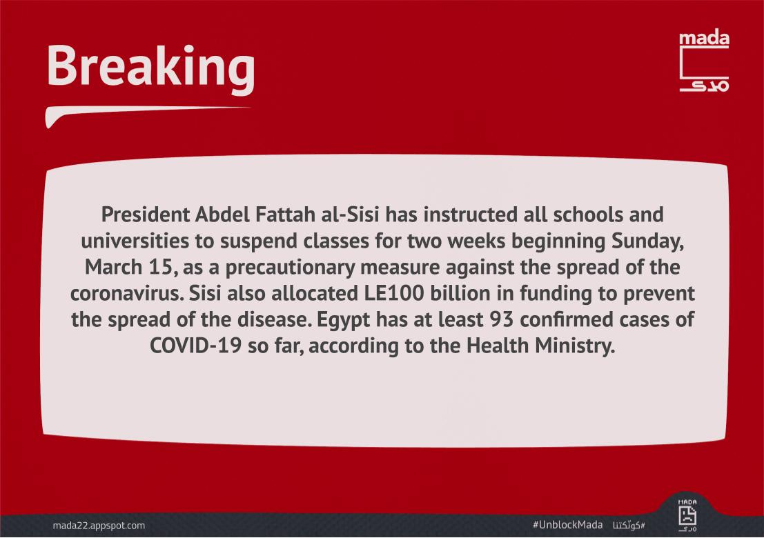 President Abdel Fattah al-Sisi has instructed all schools and universities to suspend classes for 2 weeks beginning March 15 as a precautionary measure against the spread of the coronavirus. Sisi also allocated LE100 billion in funding to prevent the spread of the disease.pic.twitter.com/eYDOiIbn56