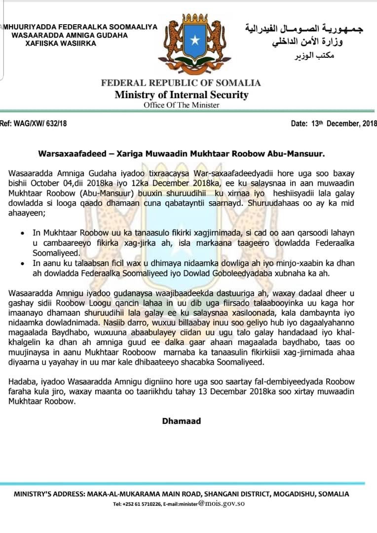 UPDATE: #Somalia's security ministry says govt was aware Mukhtar Robow arrest and he was a major threat to the security of #Baidoa town and the stability of Southwest regional state, Ministry says he was violated terms agreed with him & smuggled weapons into Baidoa. Statementpic.twitter.com/mjqLeDcE7z