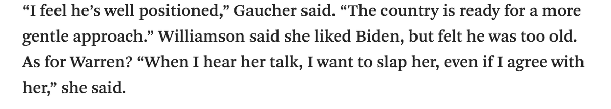 Your daily reminder that women are not immune to internalized misogyny. "Even when I agree with her"! There are so many legitimate, substantive reasons to reject a candidate that aren't "I hate the way she talks."https://twitter.com/ClareMalone/status/1195063492325367808 …