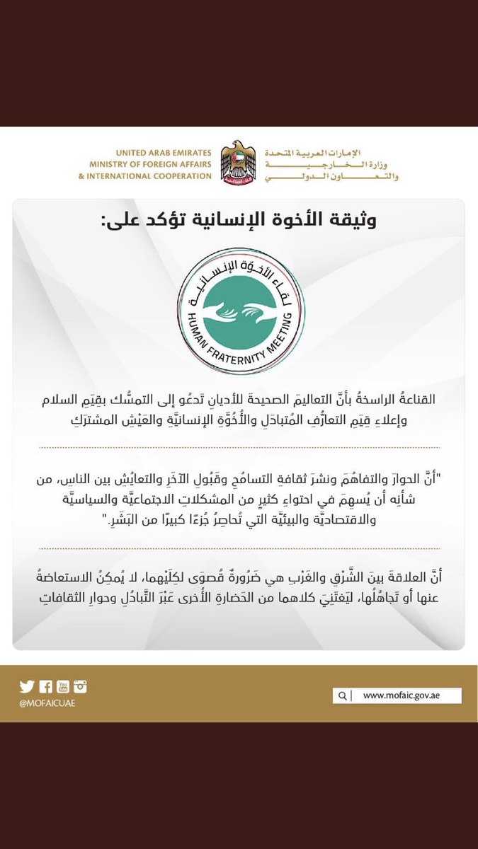 #وثيقة_الأخوة_الإنسانية#شكراً_محمد_بن_زايد#شكراً_عبدالله_بن_زايد@MohamedBinZayed@ABZayed بفضل مثل هذي المبادرات نشعر بالأمان فالعالم بفضلكم يتحرر من التطرف ويتجه نحو التأخي انتم من يستحق جائزة#نوبل للسلام لو كانت فعلاً تعطى لمن يسعى للسلام .pic.twitter.com/6XW10FzAWS