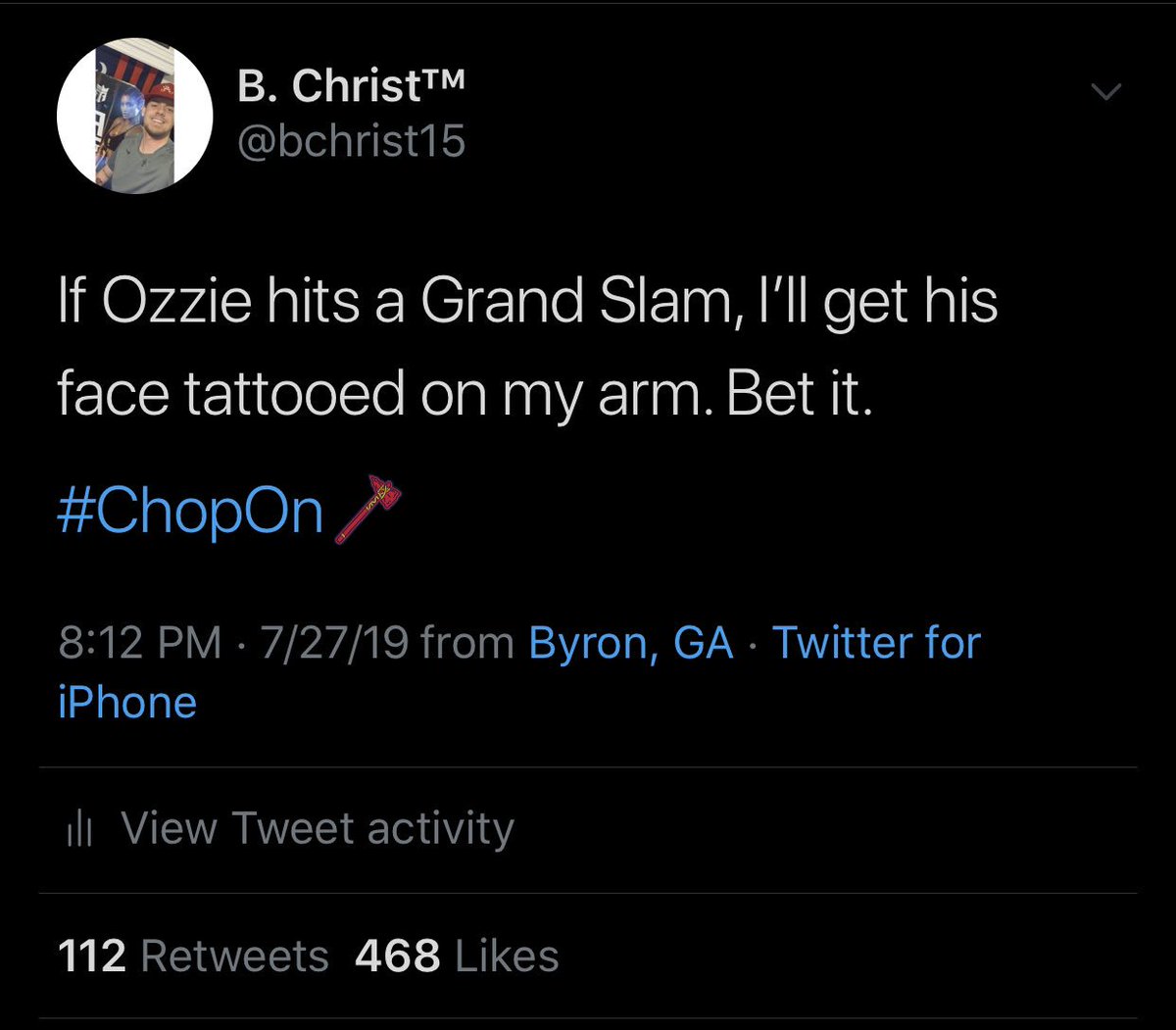@Braves Country. I’m a man of my word. I promised to get@ozzie ‘s face tattooed on my arm if he hit a Grand Slam against the Phillies... well he did! So here it is. RT and Like as much as possible so we can get it out there for those who doubted!#ChopOnpic.twitter.com/Am8VpmR5J8