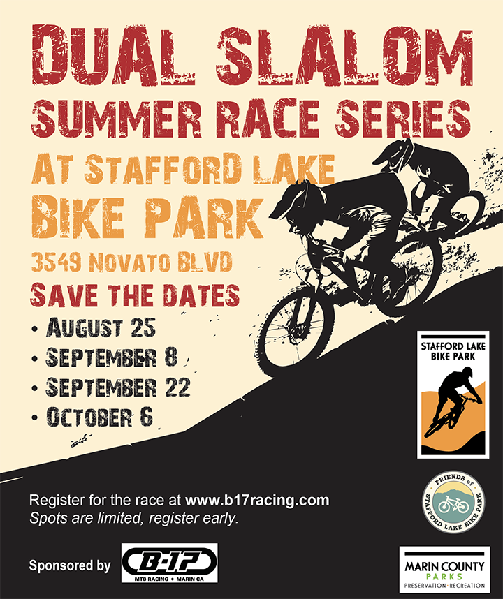 Dual Slalom summer race series continues at Stafford Lake Bike Park. Register for upcoming races taking place on 9/8, 9/22, and 10/6 at http://www.b17racing.com .