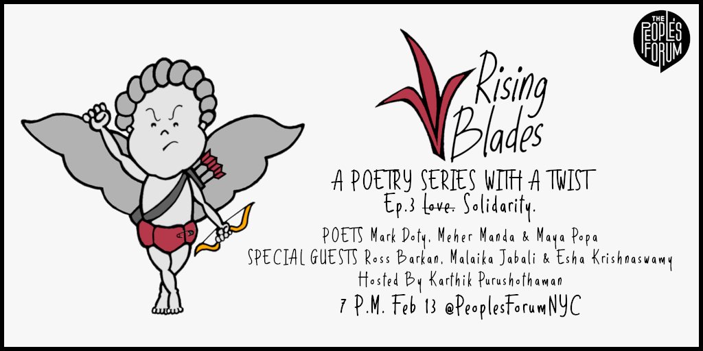 @MayaCPopa, National Book Award-winner Mark Doty &@meherness, plus talk about movement politics with@RossBarkan,@MalaikaJabali &@eshaLegal in an unusual Valentine's special next Thursday at@PeoplesForumNYC. RSVP: https://facebook.com/events/s/rising-blades-poetry-political/611113463074244/?ti=as …pic.twitter.com/tgkpbYD1Eg