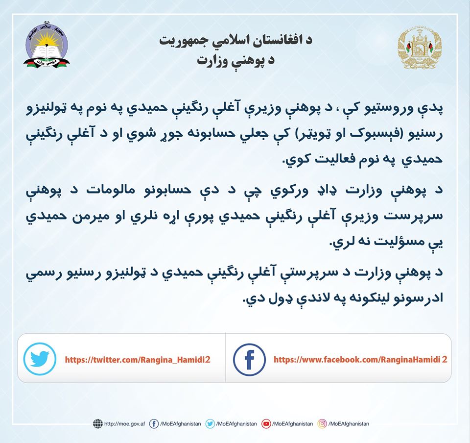 According to the Ministry of Education of #Afghanistan, the official twitter account of Ms. Hamidi is @Rangina_Hamidi2.pic.twitter.com/UVxUba5OjL