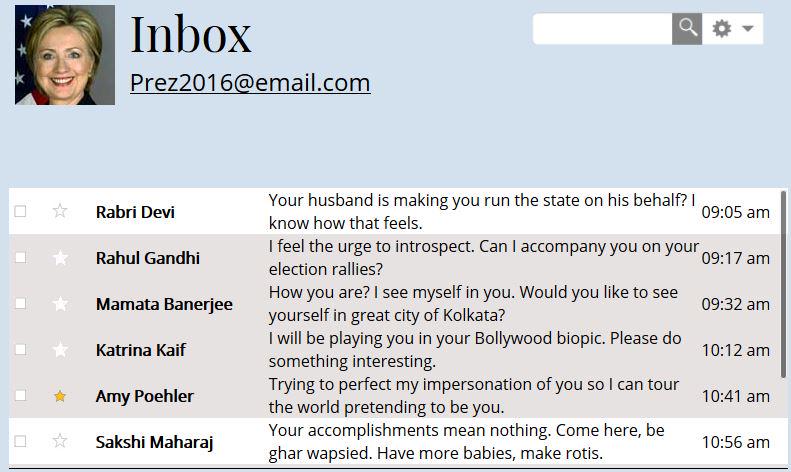 Here's why Rabri Devi sympathises with #HillaryClinton. Inbox of #Hillary2016 (satire) http://bit.ly/1cqXiOG  pic.twitter.com/kwY57HuiFe