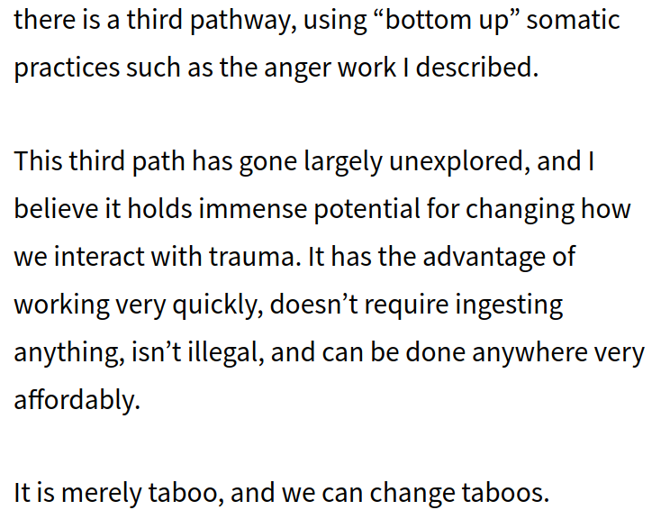 Also, re-reading it I saw "[somatic/emotion work] is merely taboo, and we can change taboos" & I want to point you at the work that me,