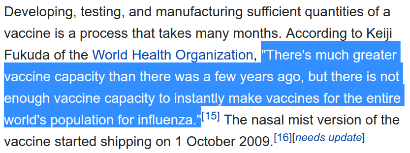 Yeah. I had assumed (for whatever reason) that whatever was happening right now was much more equivalent to like when Swine Flu / H1N1 happened in 2009, and they had a vaccine within 5 months. Excerpt below is re swine flu: https://en.wikipedia.org/wiki/2009_flu_pandemic_vaccine …pic.twitter.com/BUqU2EvDWs