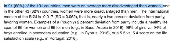 The next time you hear somebody drone on about patriarchy say: "Men are actually disadvantaged in 68% of the world's countries, and only one of the top 20 countries (Israel) favours men"pic.twitter.com/T1ev7YGNU4