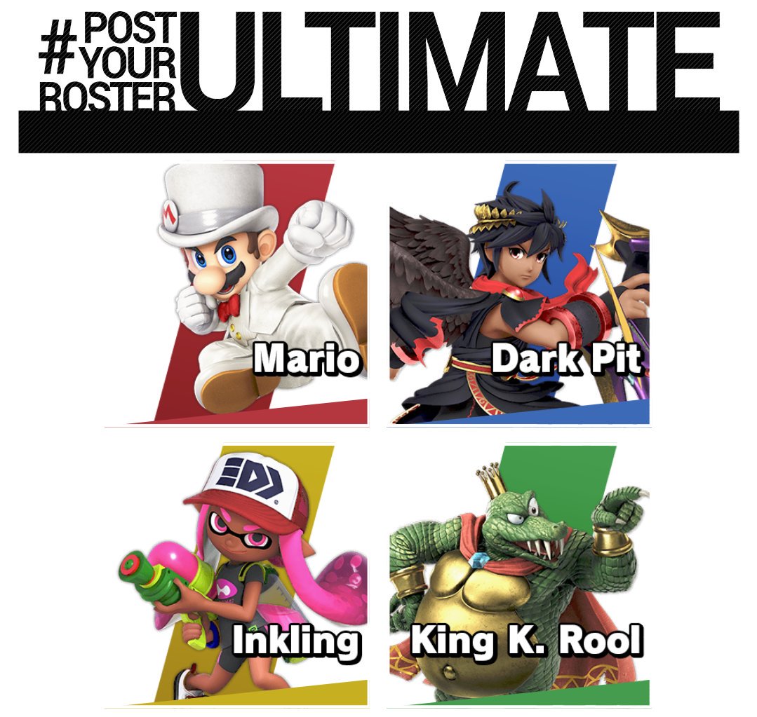 I am so jazzed for #SmashBrosUltimate and I'd love to challenge anyone to a battle when it comes out! Here is my #PostYourRoster - two of my classic picks, and the two newcomers I'm most excited to play!pic.twitter.com/jGKCxUTh31