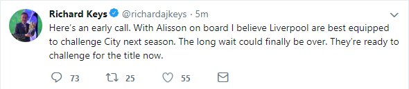The reason that LFC haven't bid for Alisson Becker is because Klopp is impressed with the maturity of Danny Ward. [Dave Maddock] In other news, I decided to turn down a date with Dua Lipa after being impressed with the wank I had in the shower this morning
