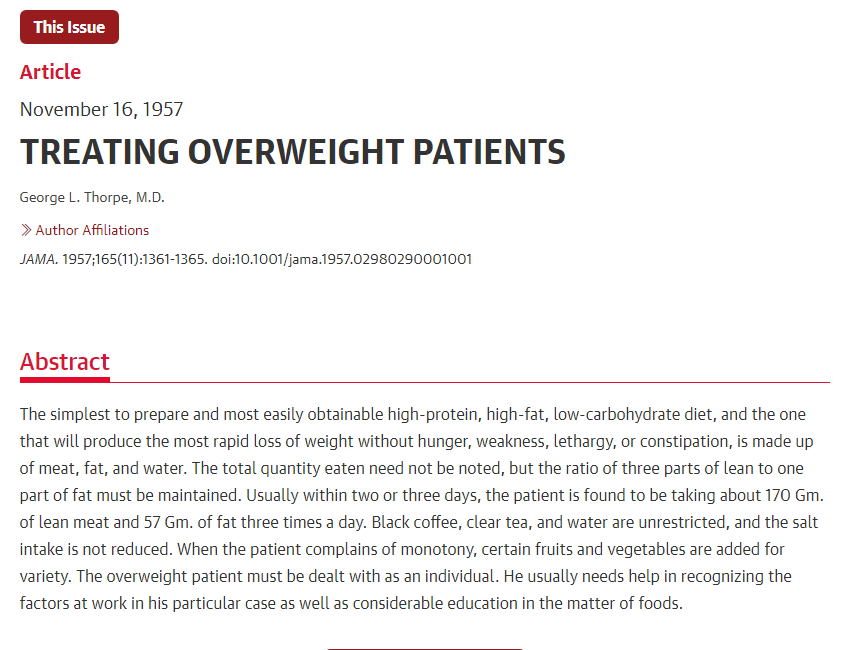 Check out: "Too Solid Flesh" from the British Medical Journal, 1959: https://europepmc.org/backend/ptpmcrender.fcgi?accid=PMC2028042&blobtype=pdf … and the rebuttal: https://www.ncbi.nlm.nih.gov/pmc/articles/PMC1992573/?page=1 … Also, Eat Fat and Grow Slim [by Richard Mackarness, M.B.,B.S. (1958)] https://www.ourcivilisation.com/fat/