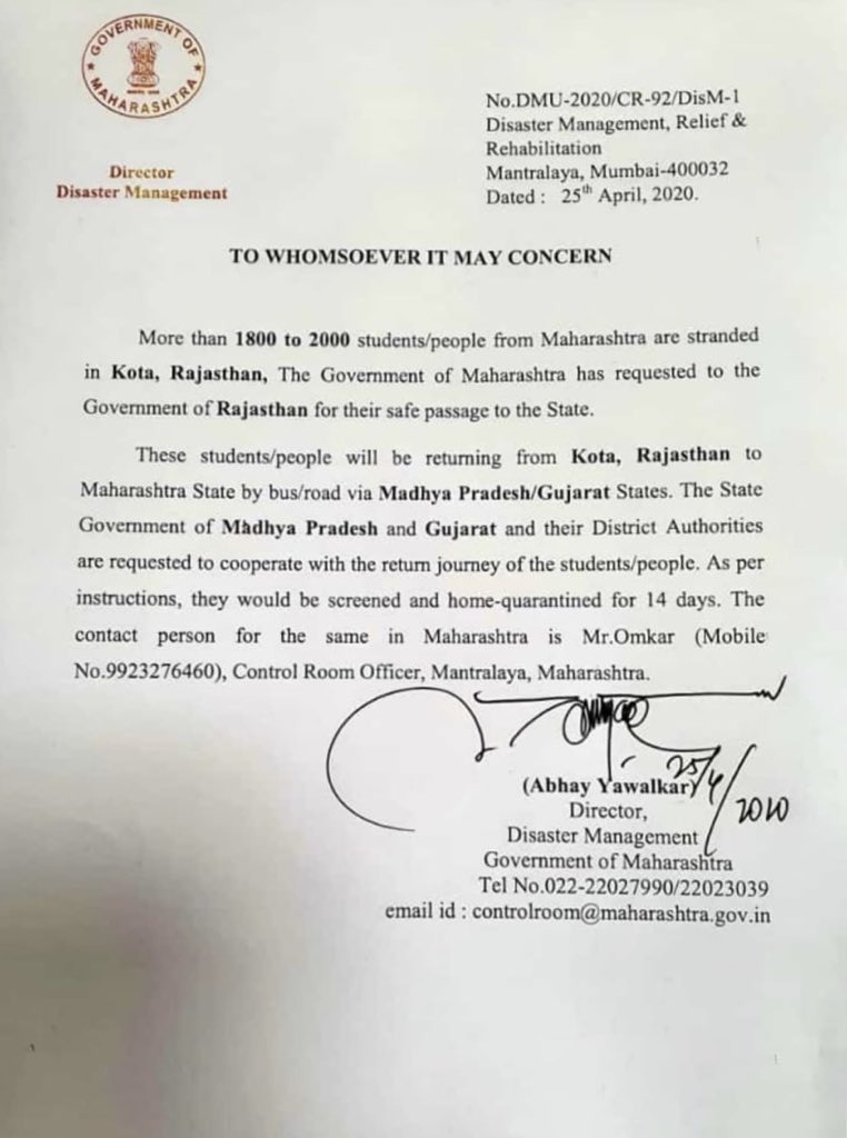 The Government of Maharashtra has requested to the Government of Rajasthan for a safe passage to 1800-2000 students from Maharashtra who are stranded in Kota, Rajasthan to the State. Once they reach back home they will be thoroughly screened and home quarantined for 14days.pic.twitter.com/R0TVa8djZM