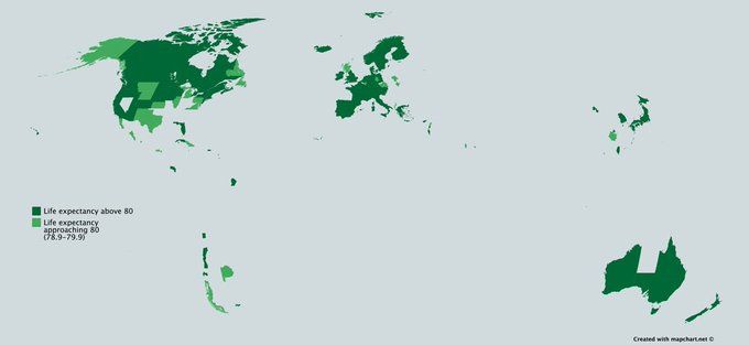 This world map shows only the regions with an average life expectancy of over 80 years. Source: https://buff.ly/2u5WDR4 pic.twitter.com/9C5l1FiEEd