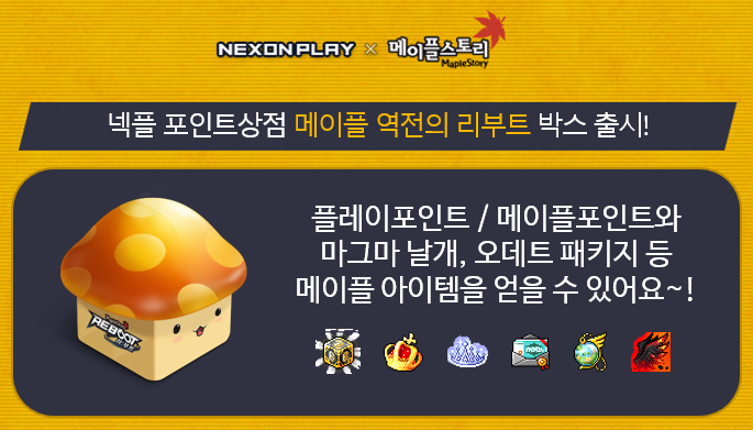 넥슨플레이 포인트상점에 "메이플 역전의 리부트 박스" 출시! 플레이포인트, 메이플포인트 그리고 마그마 날개, 오데트 패키지 등! 서둘러 확인 해보세요~ https://i.nx.com/fbW  #메이플pic.twitter.com/qC1ufRS5Eb