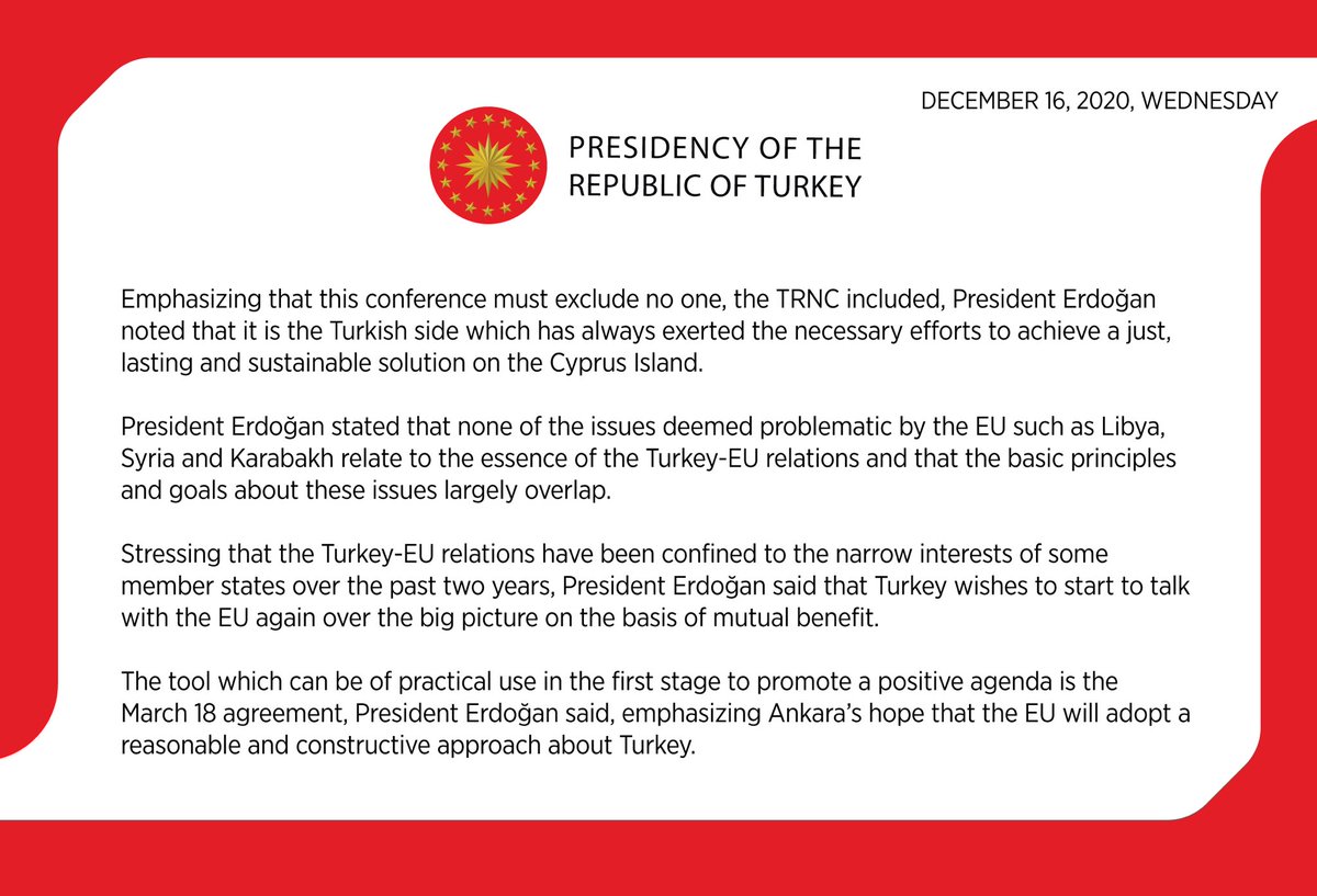 #Turkey wants an international#EasternMediterranean conference in order to obtain an indirect recognition of#NorthernCyprus. - Despite the recurrent criticism of the#EU#RefugeeFacility,#Ankara wants more of it.https://twitter.com/trpresidency/status/1339108210050031617 …