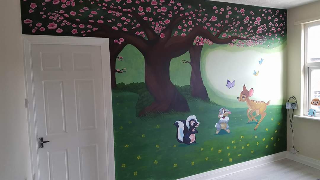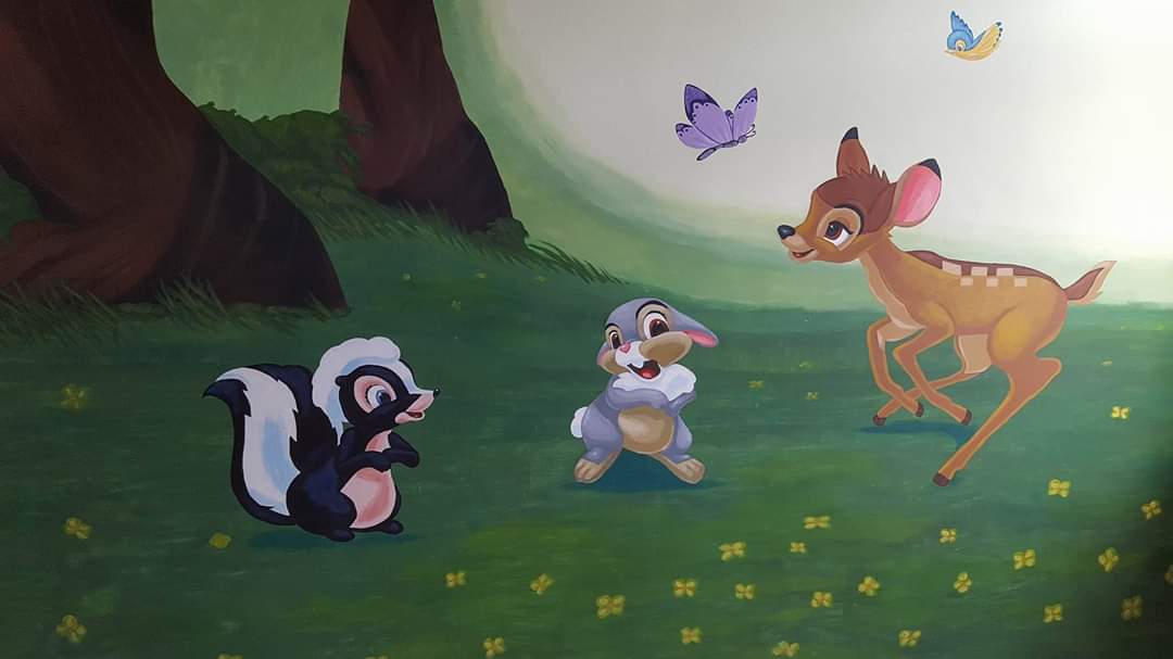 Nearly 4 years ago I painted this Bambi Mural. For the arrival of my first niece as a gift to my sister. I would drive after work and spend a couple weekends doing it before she arrived. Just thought I'd share💜 #Bambi #disney #acrylicpainting #mural #ArtistOnTwitter #paintingpic.twitter.com/VXakF3FP0e