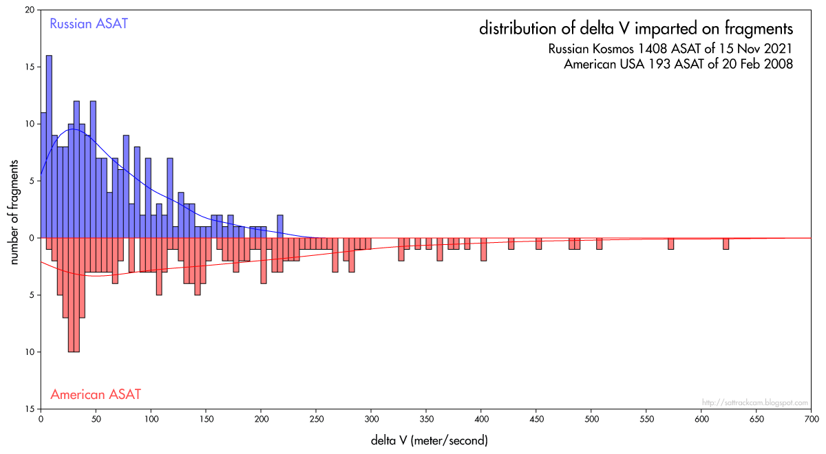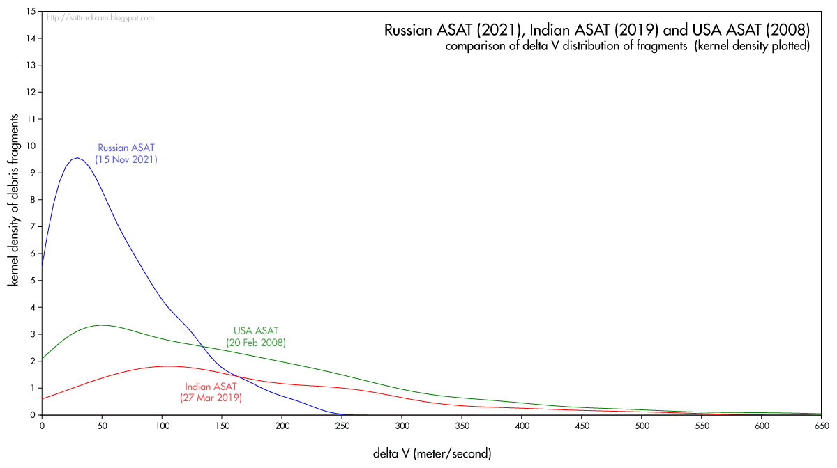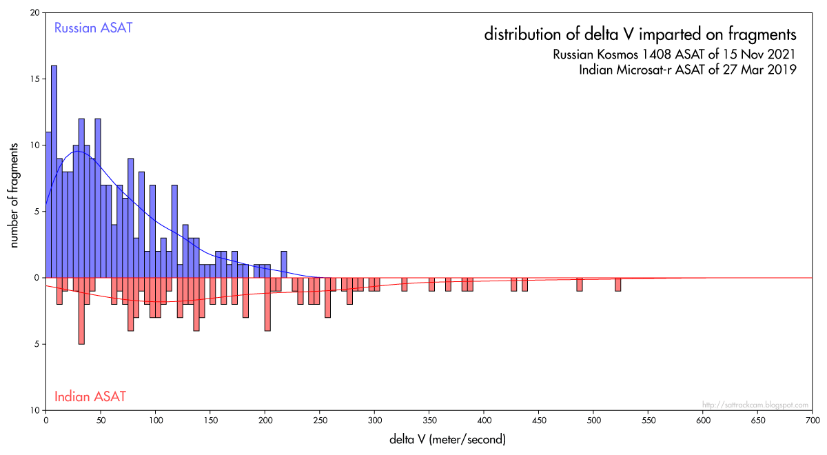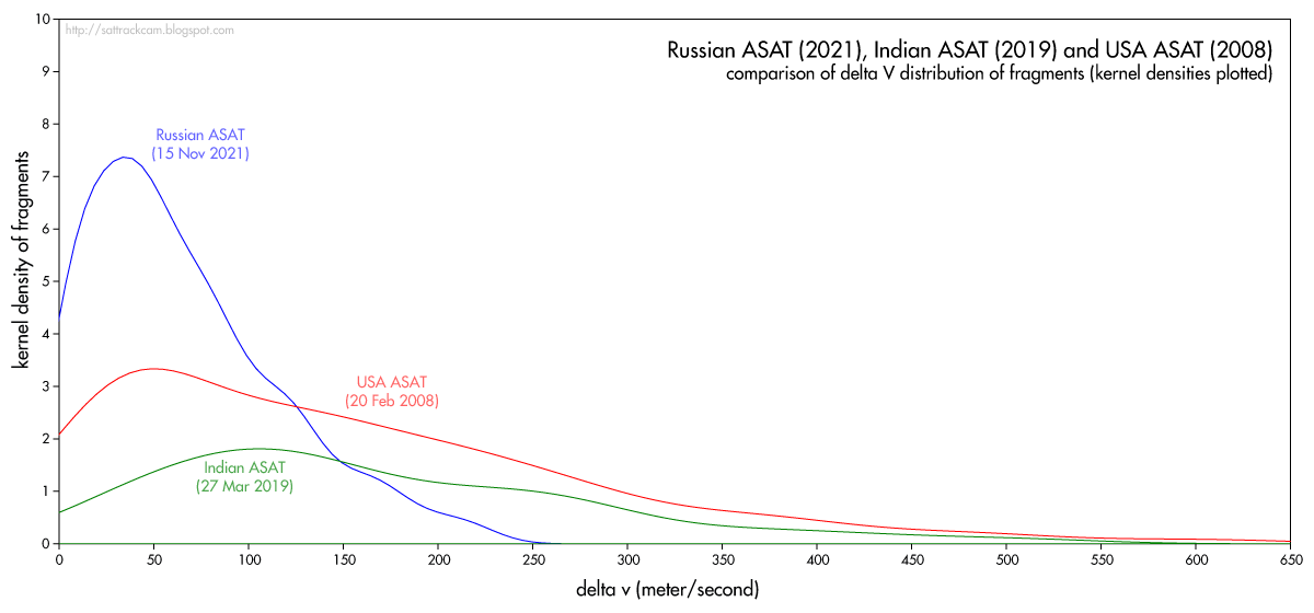 #Kosmos1408 fragments from the Russian#ASAT test of 15 Nov to that of the Indian ASAT of 2019 (Operation Shakti) and the US ASAT of 2008 (Operation Burnt Frost). The delta V distribution (cont.)pic.twitter.com/3sOx68YFC2