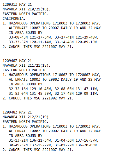 There is more going on in that area (haven't look into it yet) SUA active area(s) close to the NAVWARN in your map between May 11 and May 18pic.twitter.com/awKO4F6Qgc