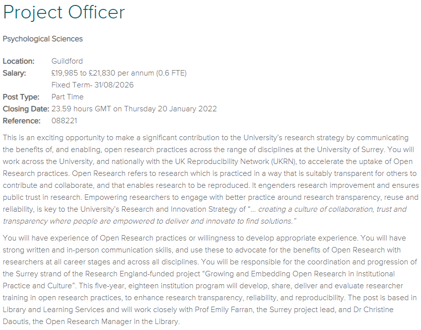 @UKRN@ResEngland project (linked post below). http://jobs.surrey.ac.uk/088221 You will contribute to@UniOfSurrey research strategy, accelerate uptake of OR practices & evaluate OR training. 0.6FTE 5 years, deadline 20th Jan. https://twitter.com/tomstafford/status/1463907286037024778 …pic.twitter.com/qsTcZr9zBd