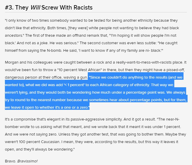 So you're telling me "social justice warriors" staff DNA-research firm/s resulting in what amounts to semi-lies "just to keep you wondering" on your results? Hmmn, so my recent 1% african 1% asian might just be 'rounding' from someone who wants to be sure I'm not a bigot?