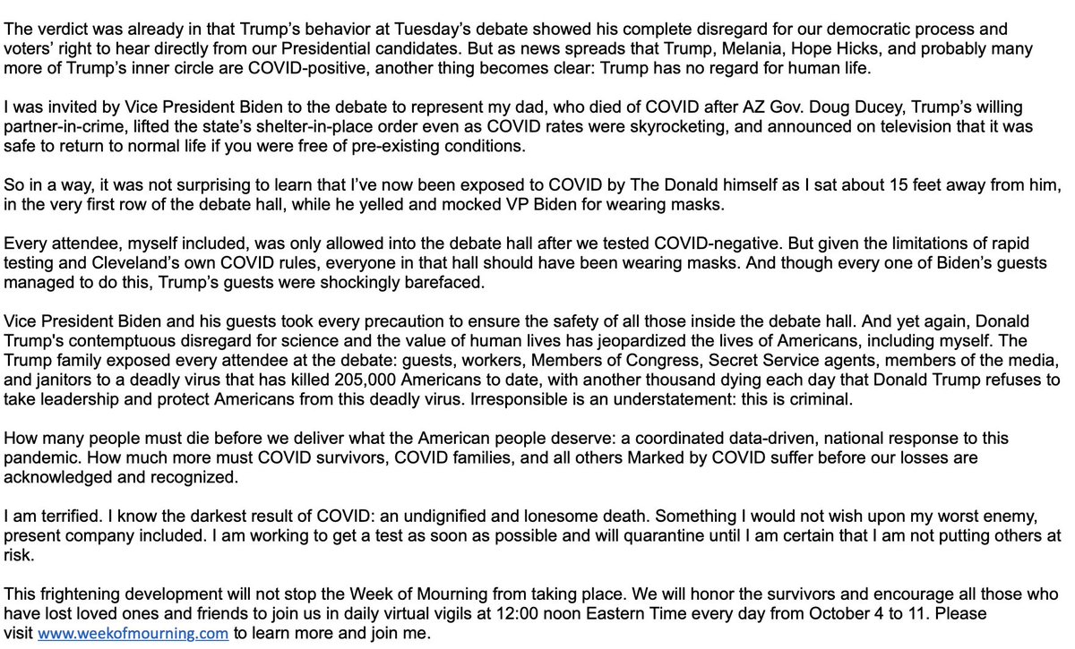 While we haven't heard from the Biden campaign yet, we are getting the 1st reaction from a guest they invited to the debate @kdurquiza, who commends them for precautions they took But shes “terrified” given she knows the “darkest result” after seeing her dad succumb to the viruspic.twitter.com/K18ecXpeey