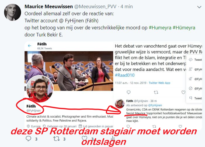 Deze SP Rotterdam stagiair Fatih Hijnen @FyHijnen hoort niet in stadhuis Rotterdam rond te lopen en dient onmiddellijk te worden ontslagen. Kan