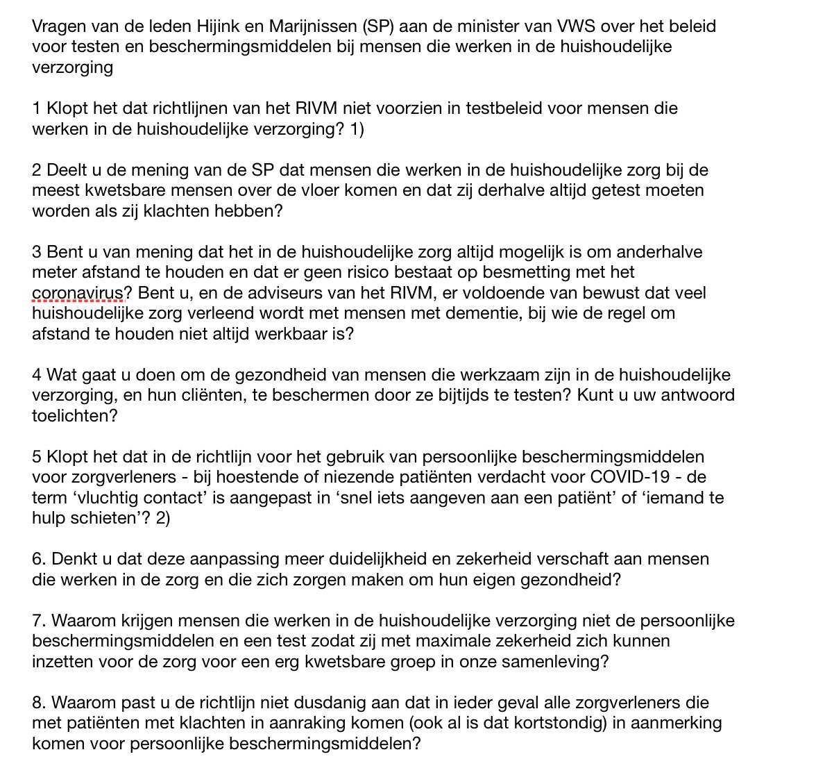 Vragen gesteld met ⁦@MarijnissenL⁩ over het niet testen van mensen die werken in de huishoudelijke verzorging. Juist deze zorgverleners komen thuis bij de meest kwetsbare mensen. Voor hun eigen gezondheid - en die van ouderen - zijn testen en bescherming cruciaal! pic.twitter.com/GynIq8otYy