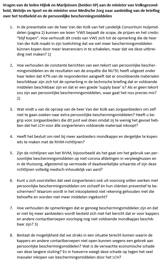 De briefing in de Tweede Kamer over het testbeleid en beschermingsmiddelen riep veel vragen op. Samen met @MarijnissenL deze vragen ingediend. Wordt er wel massaal ingekocht in voorbereiding op eventuele versoepeling van -bijvoorbeeld- maatregelen in verpleeghuizen?pic.twitter.com/QR3sas2UNo