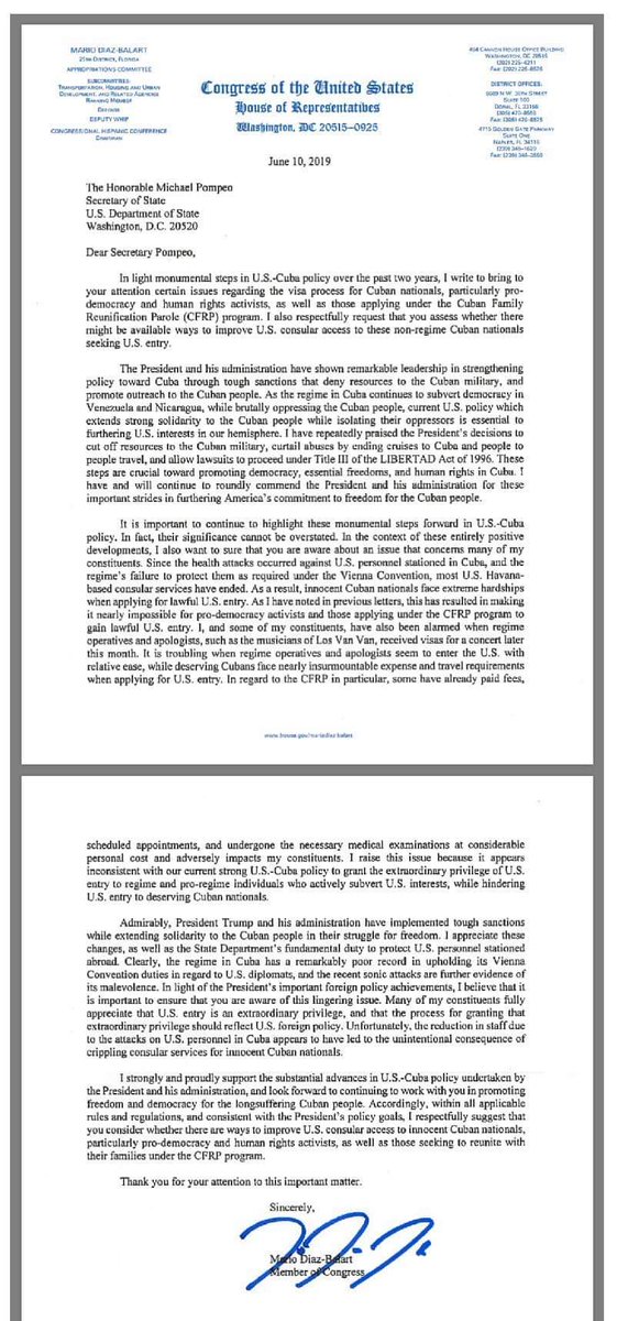 Gracias Sr. Mario Díaz-Balart por su interés en ayudar a nuestra causa.
