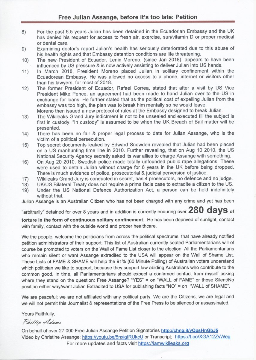 Well said Marise, The Free Julian Assange Petition Notice 27, has been delivered to your inbox. 8 yrs of Arbitrary detention plus solitary torture for 280 days. It is Lawful to save Julian Assange an Australian Citizen & Journo. Sign Petition via http://chng.it/yQpsHnGbJ5