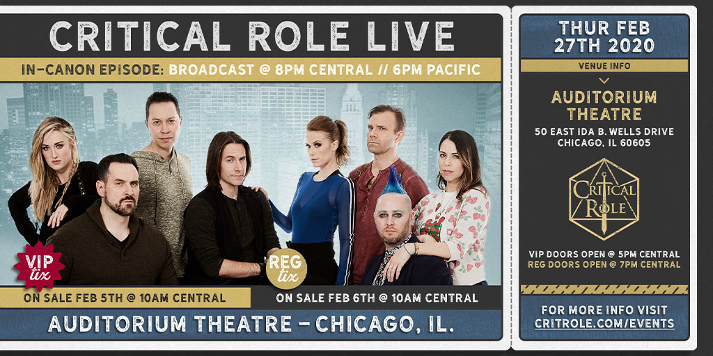 CHICAGO LIVE SHOW HYPE! Join us at the Windy City's historical Auditorium Theatre for a special live, in-canon episode of CR -- Thursday 2/27 at 8pm Central / 6pm Pacific! VIP tix on sale 2/5 at 10am CST, regular tix on sale 2/6. For full details, visit: http://critrole.com/event/live-show-critical-role-in-chicago-2020 …pic.twitter.com/RfRUsc9md9