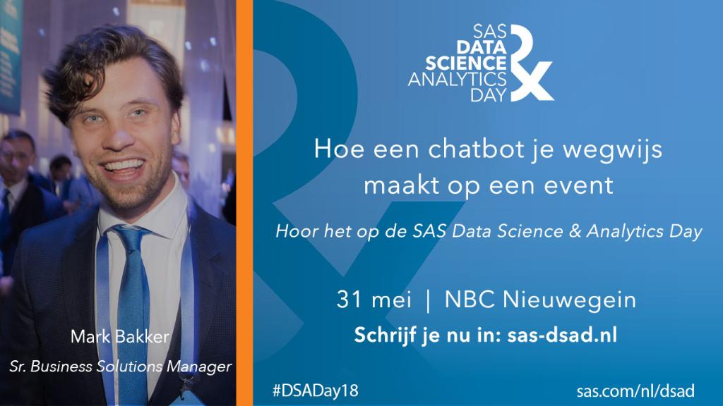 #chatbot ‘Fin’ je wegwijs maakt tijdens de SAS Data Science & Analytics Day op 31 mei. http://2.sas.com/6015Dguut DSADay18#datasciencepic.twitter.com/MrXMIBuIe5