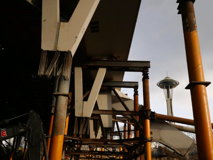 The historic Seattle Arena roof is now floating over what will soon be the new home of