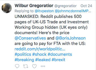 '"The USA reserves the right to withdraw all trade, aid and communication upon the non-compliance of the UK to allow open discussions about the sale of all assets within and partnered with the National Health Service" Sell NHS Assets & lease them back to trusts at huge profits