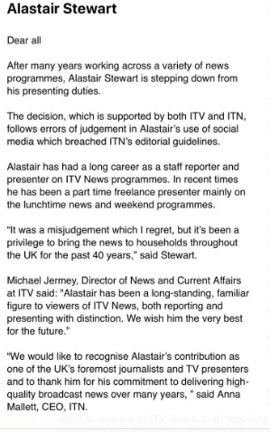 oof. ITN suspending presenter Alastair Stewart for "errors of judgement" on social media.