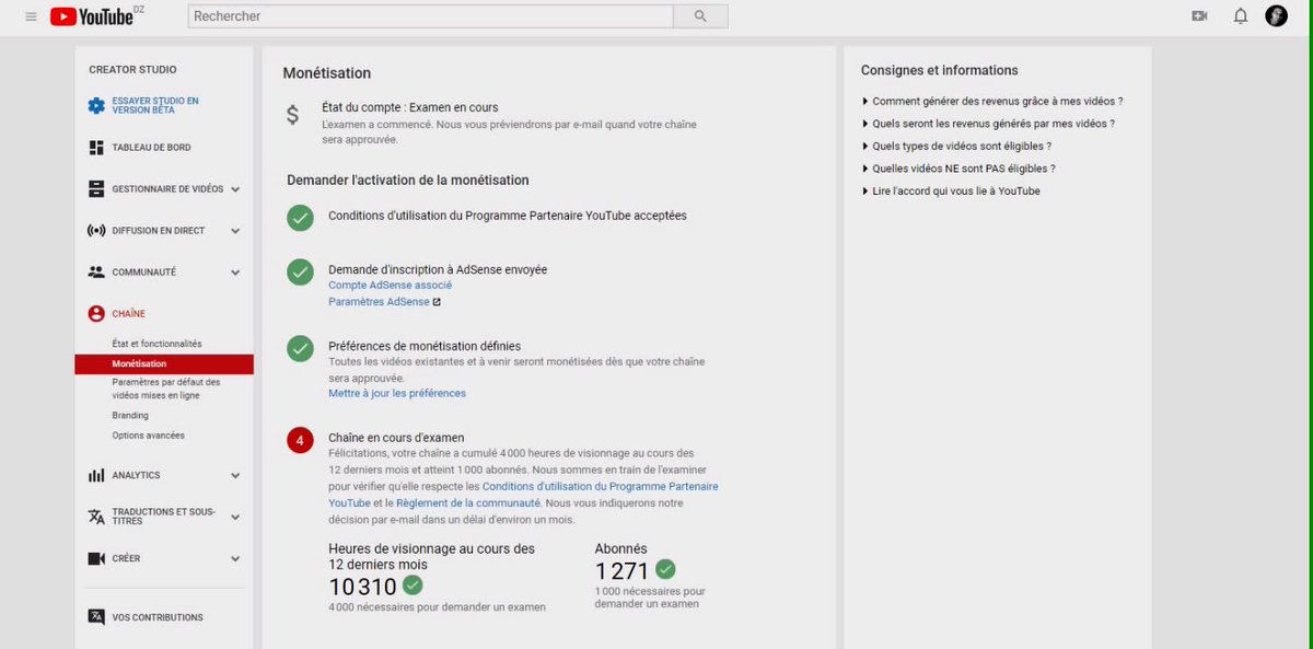 Bonjour. Chaque candidature est inspectée avec soin et revue manuellement par nos équipes de spécialistes. En raison du nombre élevé de demandes, l'examen peut prendre du temps. On vous invite à suivre l'évolution de celle-ci dans l'onglet "Monétisation" du Creator Studio.