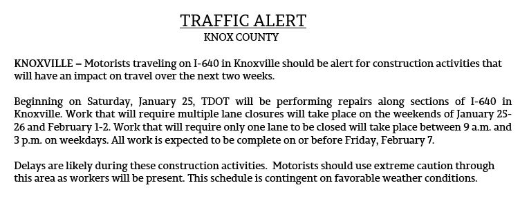 Heads up for motorists in Knoxville. Repairs to be made along I-640 over the next two weeks. Details here: