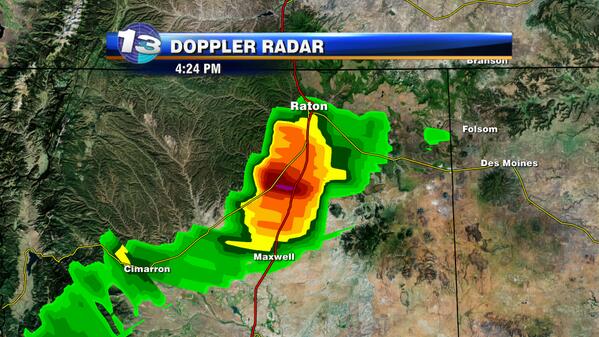 Here is the severe storm approaching Raton #NM. Moving NE at 25mph. 60 mph winds and quarter sized hail. #nmwxpic.twitter.com/zs7ee8KNkQ