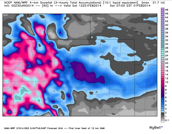 0z NAM:: ~3-6" of #snow for #Denver metro, with an area of >6" to the east of town. Prudent bet for time being. #COwxpic.twitter.com/vTw4nzsdwf