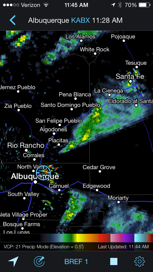 Rain now stretching from Placitas to Santa Fe. Best chance for rain in #ABQ metro this PM. #nmwxpic.twitter.com/5c7rwtylrC