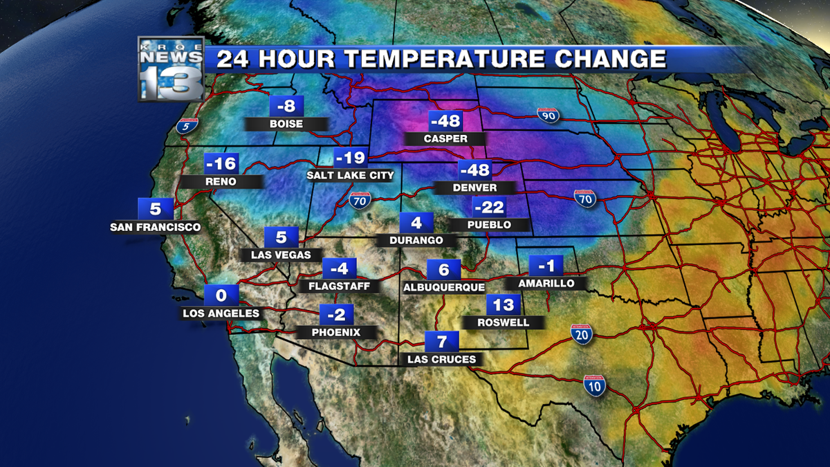 Check out the 24 temp change. The cold air cometh at least across eastrern #NM. #nmwxpic.twitter.com/BNDj3EyJdS