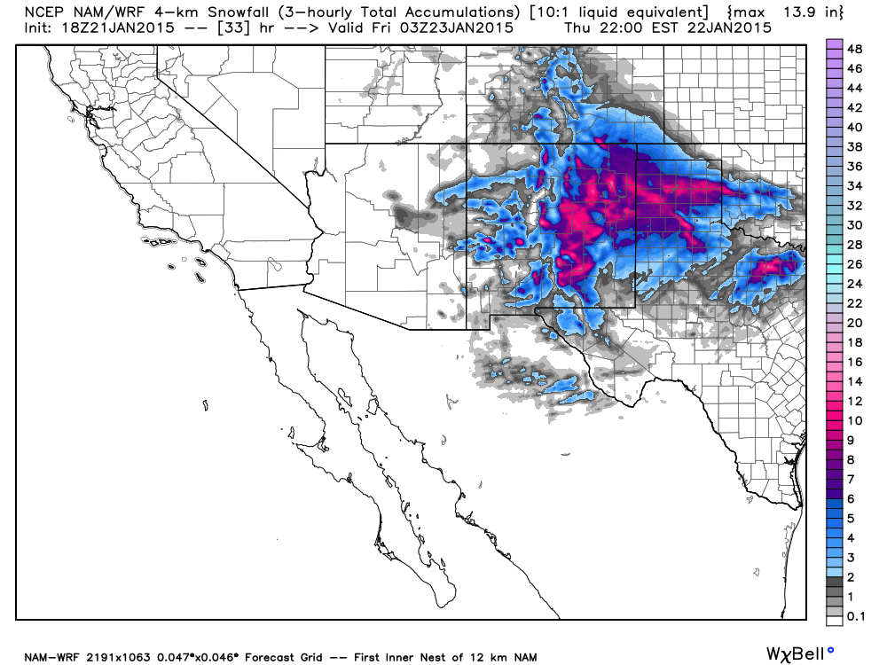 Latest model (NAM) look at potential snowfall numbers through Thu. #nmwxpic.twitter.com/XbS9tsMqwQ