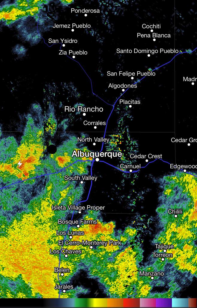 #ABQ will pick up pockets of heavy rain, frequent lightning and pea sized hail over the next hour plus #nmwxpic.twitter.com/jnHYGHuxIH