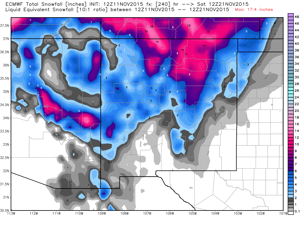 Next week looks very promising for storms. The Euro 10 day snow outlook should make our resorts happy. #ski #nmwxpic.twitter.com/UWtrdBZrux