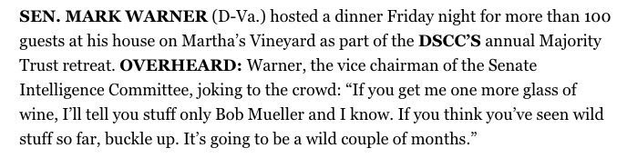 Leakers always leakin' "If you get me one more glass of wine, I’ll tell you stuff only Bob Mueller and I know. If you think you’ve seen wild stuff so far, buckle up. It’s going to be a wild couple of months,”