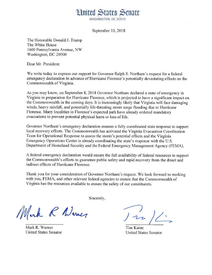 Thank you Senators Warner and Kaine and Governor Northam. It is extremely important that the federal emergency be declared in advance of landfall. Emergency responders must be able to act efficiently and effectively once the storm hits.