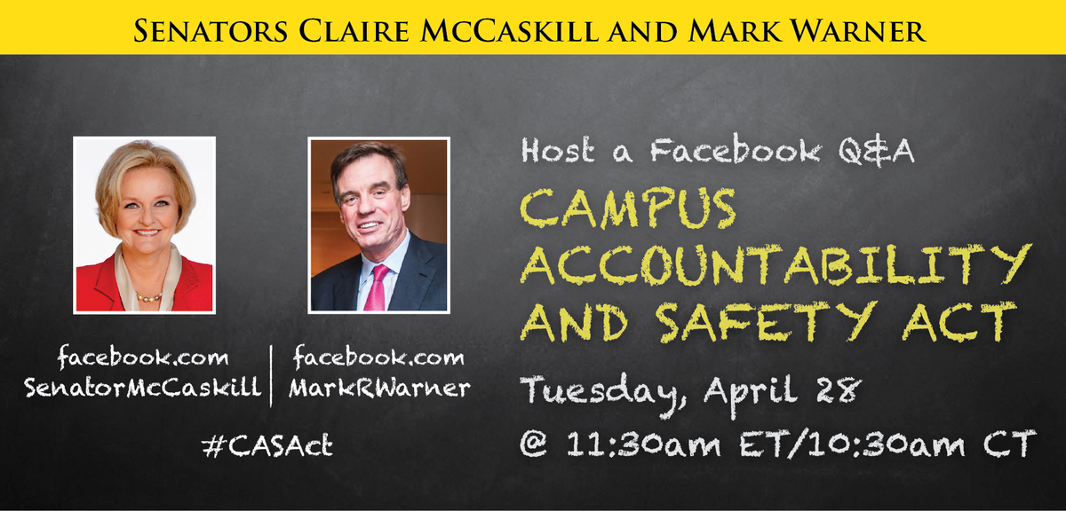 Got a question about campus sexual assault or #CASAct for me & @clairecmc? Submit it here: http://on.fb.me/1KknmpZ pic.twitter.com/TqJE0fazHM