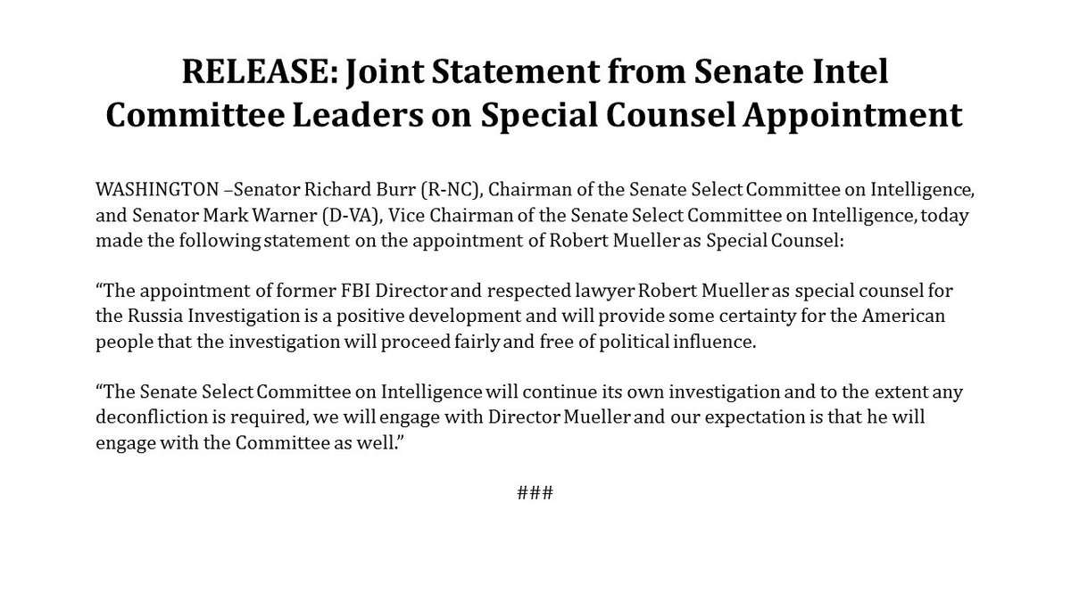 Joint statement with @SenatorBurr on the appointment of Special Counsel Robert Mueller:pic.twitter.com/OwpFoCNaZj