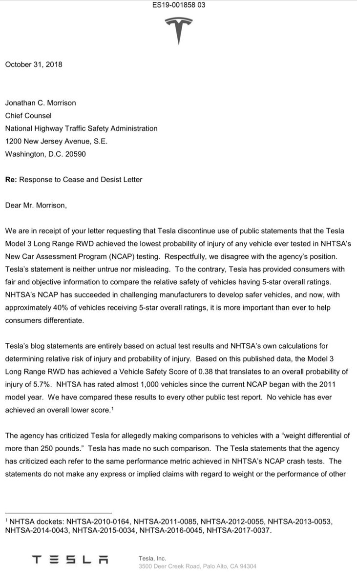 Here is Tesla’s response to the NHTSA Cease and Desist. It’s worth a read.